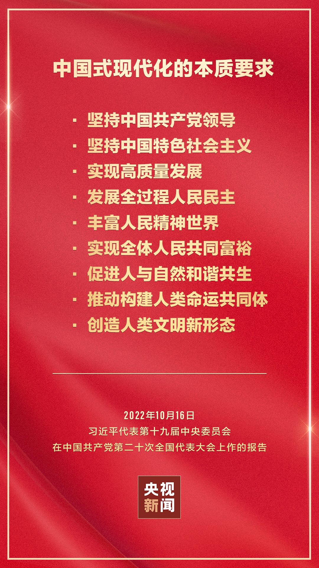 这次党的二十大报告专门阐述了中国式现代化的中国特色和本质要求。简单说,中国式现代化,是中国共产党领导的社会主义现代化,既有各国现代化的共同特征,更有基于自己国情的中国特色。具体来说,它有五个方面的中国特色和九个方面的本质要求,比如注重的是实现全体人民共同富裕,走的是和平发展道路等等。