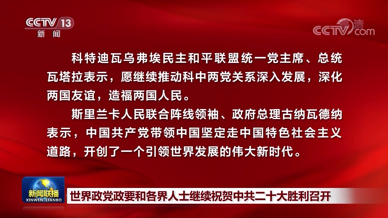 斯里兰卡人民联合阵线领袖、政府总理古纳瓦德纳表示,中国共产党带领中国坚定走中国特色社会主义道路,开创了一个引领世界发展的伟大新时代。