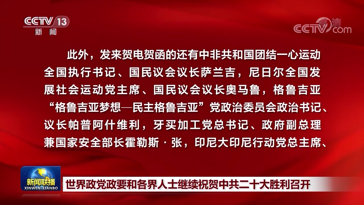 在中国共产党第二十次全国代表大会召开之际,世界政党政要和各界人士继续致电致函中共中央和习近平总书记,热烈祝贺中共二十大胜利召开。