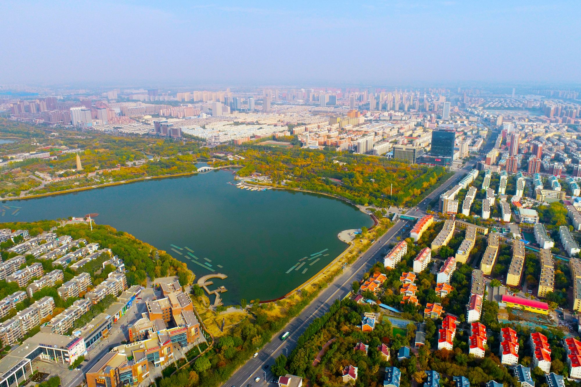 10月20日,宁夏银川,清澈的湖水和秋染的树木与居民区共同勾画出一幅生态与人居和谐相融的画卷。图/IC photo