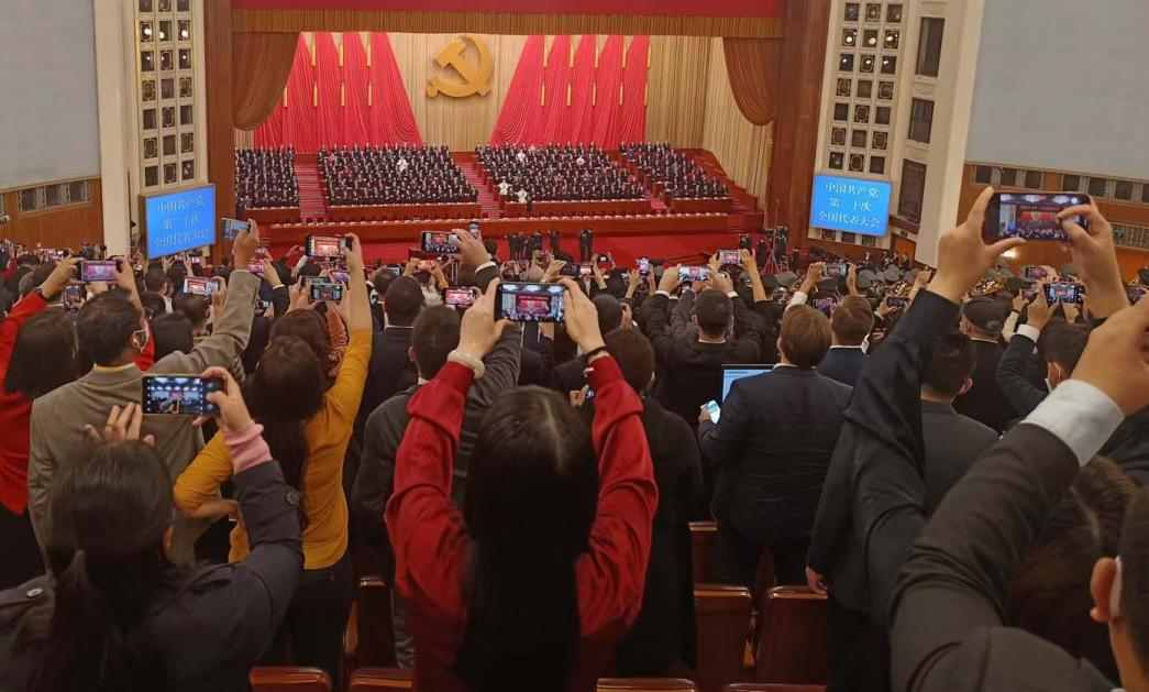2022年10月16日,中国共产党第二十次全国代表大会开幕会正在举行,记者们争先拍照记录这一时刻。布莱恩·奥蒂诺摄